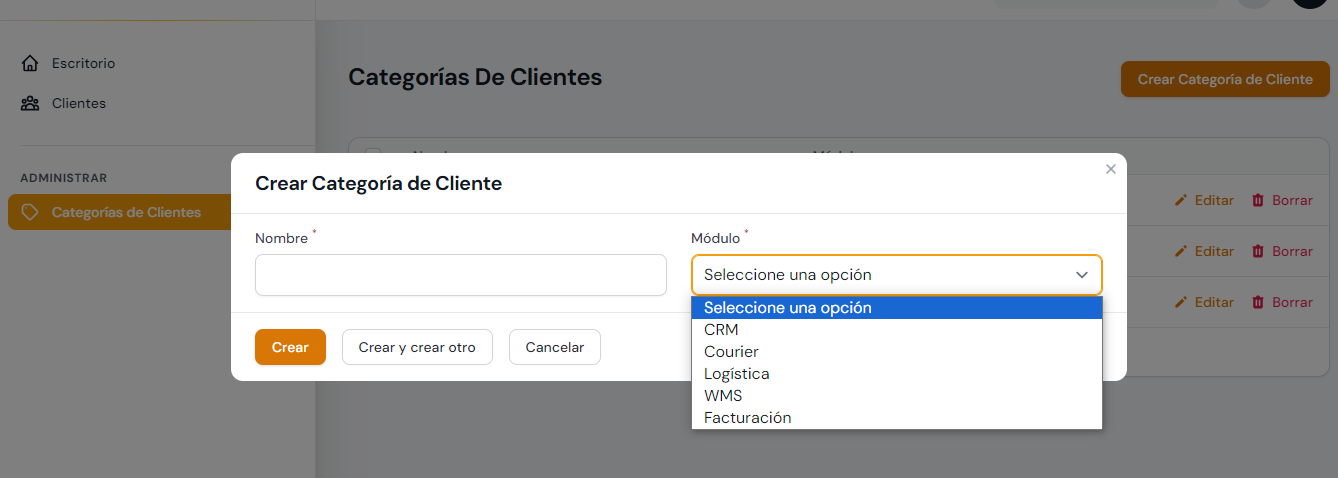 una categoría perteneciente al módulo de Logística, los datos de este cliente serán visibles desde