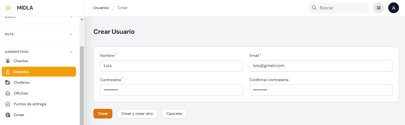 con el nombre "Crear usuario". Se debe ingresar el Nombre, Email y Contraseña que el usuario