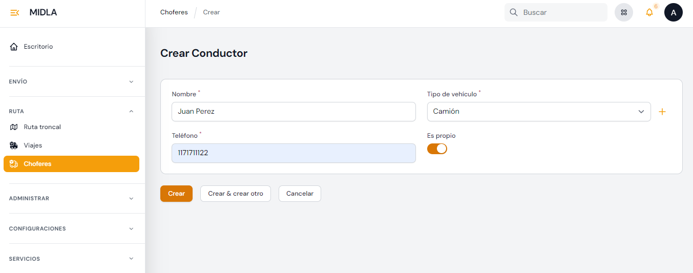 En la Página Principal de Choferes haciendo clic al botón "Crear Chofer" el operador será redirigido al formulario de creación, donde deberá ingresar el Nombre, Teléfono y seleccionar el Tipo de vehículo que manejará el chofer.