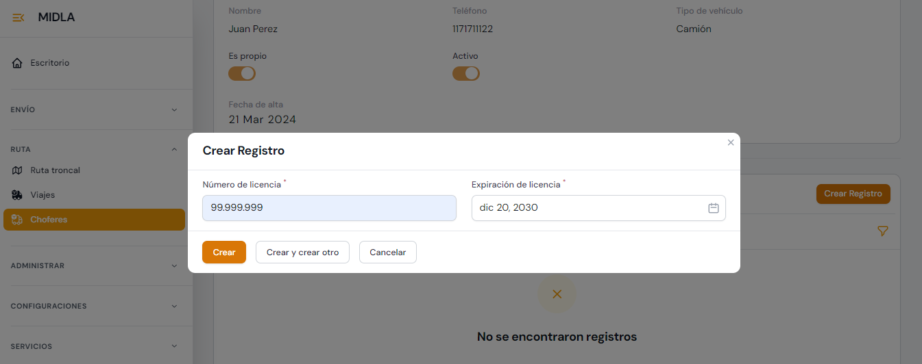 Una vez creado un chofer, podrá ingresar la información sobre el Registro de conducir que posea el mismo. Se deberá ingresar el número y la fecha de expiración.
