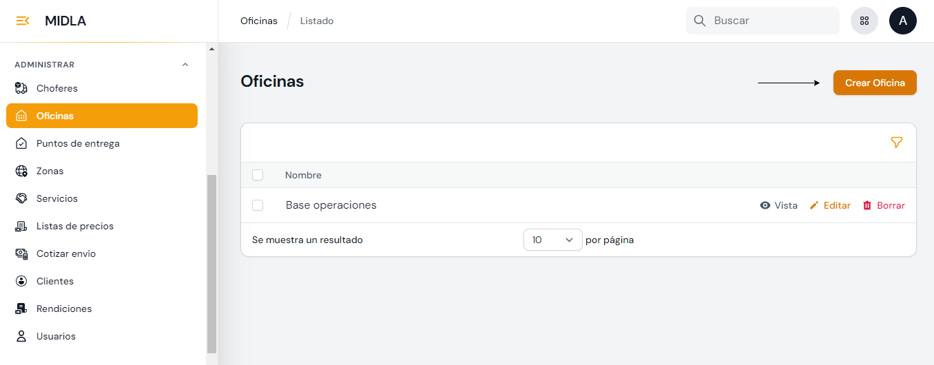 Ubicado en la sección Administrar se encuentra una pestaña dedicada a la gestión de Oficinas. Las oficinas se refieren a los distintos Depósitos o Sucursales pertenecientes al operador logístico para recepcionar o almacenar los paquetes de los envíos antes de ser enviados a su destino final.