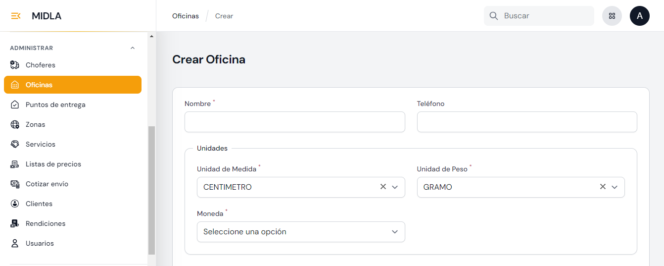 En la Página Principal de Oficinas haciendo clic al botón "Crear Oficina" el operador será redirigido al formulario de creación, donde deberá ingresar el Nombre, especificar la Unidad de Medida, Unidad de Peso y Moneda. Las especificación de las unidades de medida permite estandarizar la información relacionada a las dimensiones de los paquetes de los envíos, como ancho, alto y profundidad. Por último, se debe ingresar la dirección correspondiente a la ubicación de la Oficina o sucursal.