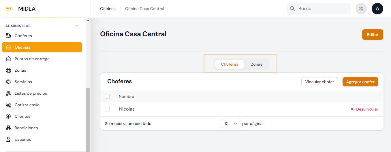 Una vez creada una oficina, se debe vincular con los choferes y zonas que estén previamente creadas.