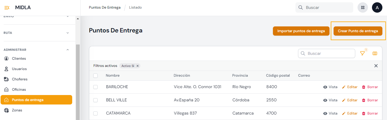 En la vista del listado de Puntos de entrega, se encuentra un botón denominado Importar Puntos de entrega que permite la creación masiva de estos. El archivo que se debe utilizar para realizar la importación contiene campos requeridos que son necesarios para que se pueda realizar la importación de forma correcta. Haga clic aquí para descargar una plantilla con datos de ejemplo. Este archivo contiene los datos para importar un punto de entrega con un horario de lunes a viernes.