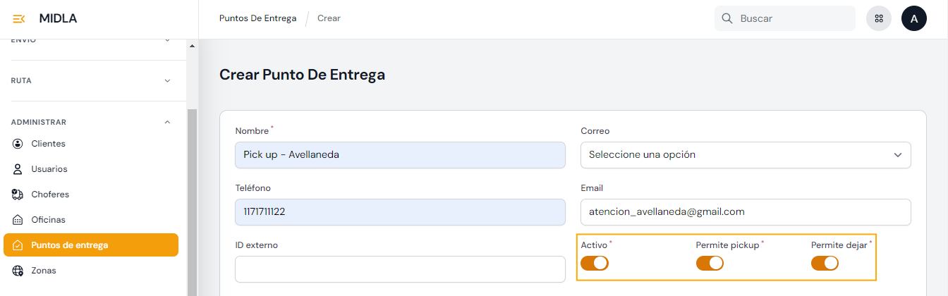 - ID externo: ID correspondiente al punto de entrega si el mismo es de una empresa logística externa.