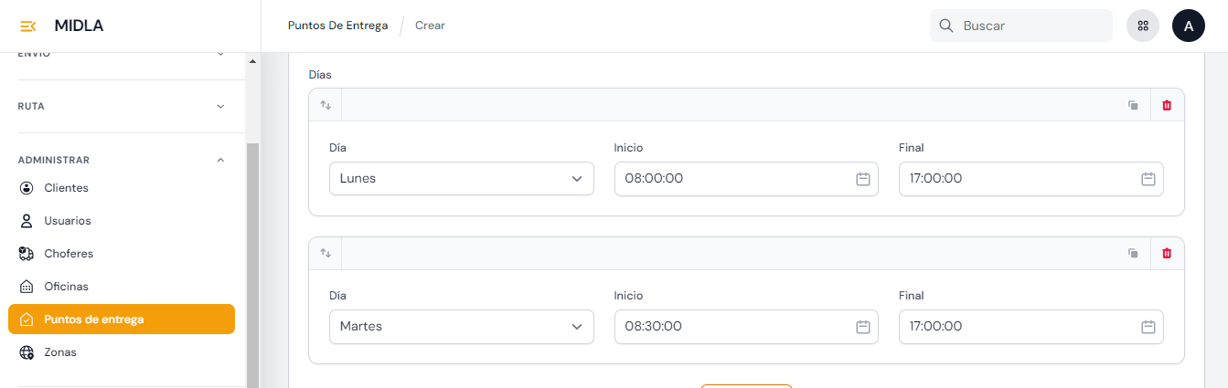 - Días: En la sección de Días deberá especificar los días y horario de atención del punto de entrega. Deberá seleccionar el día (lunes, martes...) y el horario de inicio y cierre (formato 24hs, con la posibilidad de establecer dos horarios distintos para un mismo día). Este horario es visible en la cotización de envíos, tanto para plataformas ecommerce como el portal de clientes.