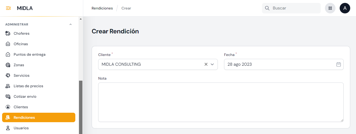 En la Página Principal de Rendiciones haciendo clic al botón "Crear Rendición" el operador será redirigido al formulario de creación. En este formulario, deberá seleccionar el cliente y establecer una fecha.