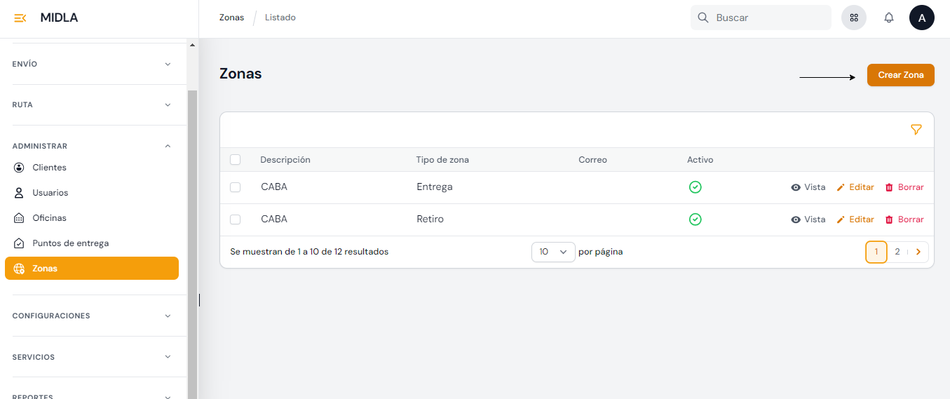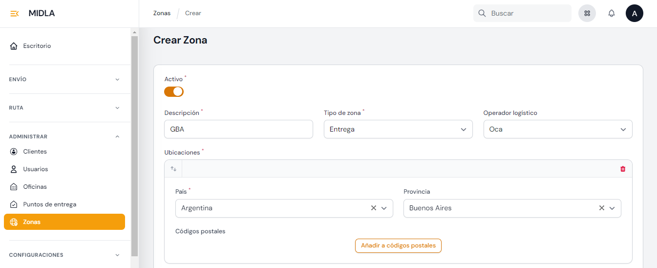 En la sección Administrar se encuentra la pestaña Zonas donde la empresa logística puede definir los rangos de códigos postales que cubre, organizados por país y provincia. Al definir estas zonas, la empresa puede planificar rutas y crear servicios para la cotización de entregas y retiros. Estas zonas de cobertura son especialmente importantes para la cotización de envíos desde plataformas ecommerce y desde el portal de clientes para la creación de envíos.