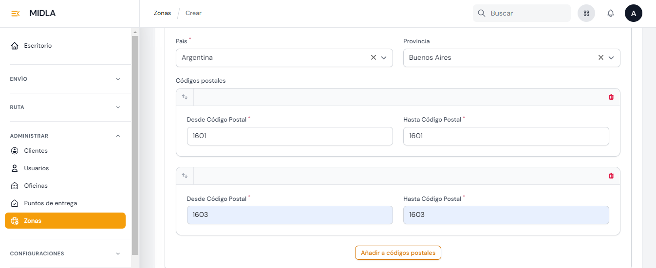 - Códigos postales: Se debe ingresar el rango de códigos postales que se quieran incluir, según el país y la provincia seleccionada.
