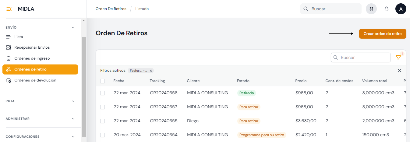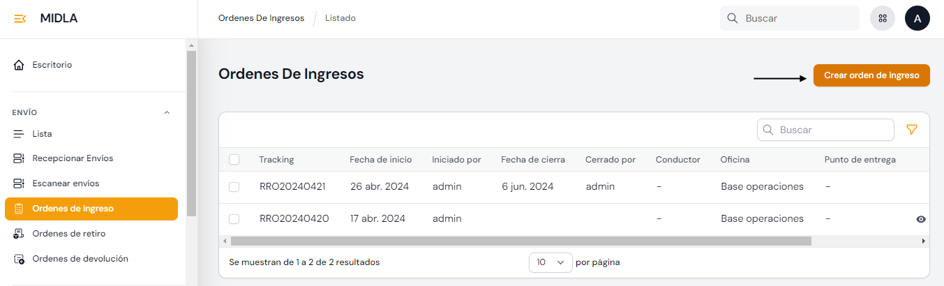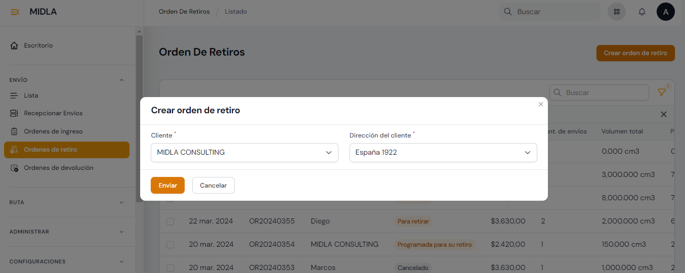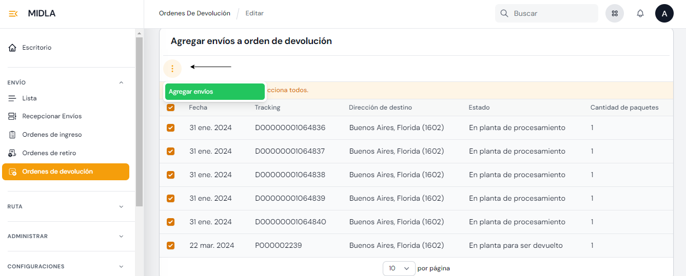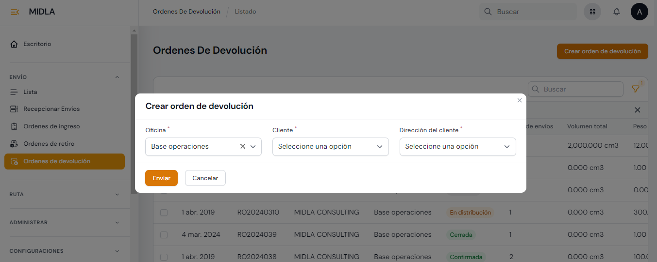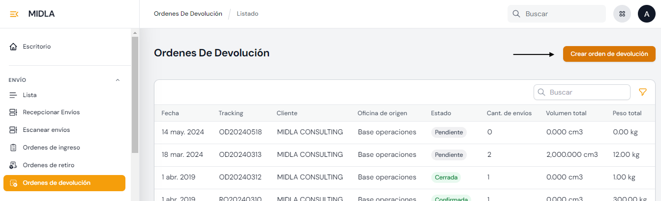 Desde la sección Envíos de Midla SAAS se pueden crear Envíos y tener un listado de todos los envíos creados manualmente y los integrados a través de plataformas Ecommerce.