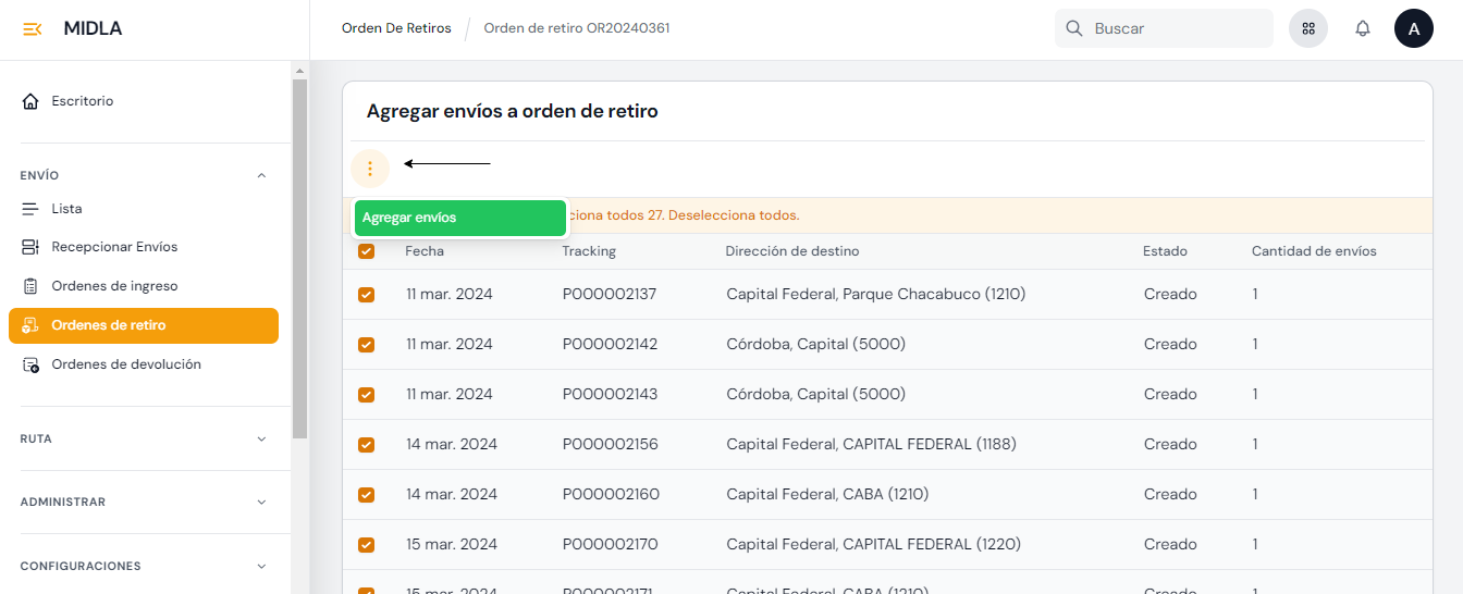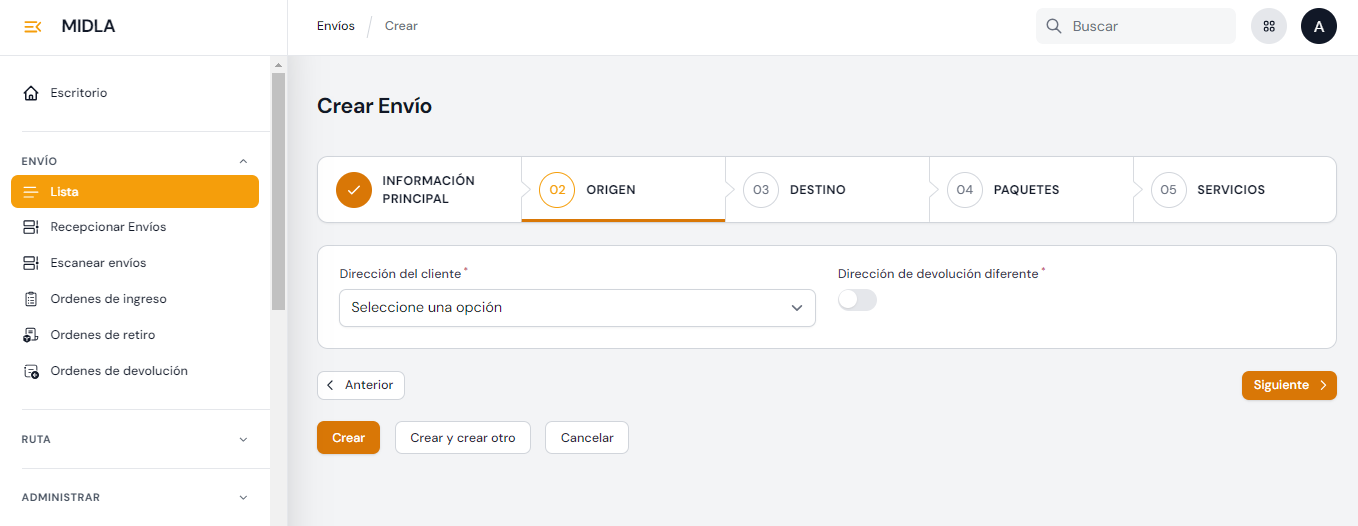 - Seleccionar el cliente: Elija el cliente para el cual se crearán los envíos.