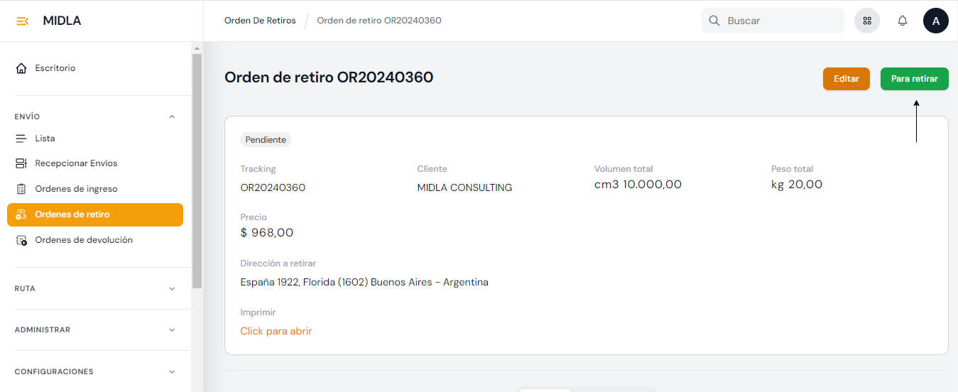 | En el cliente para ser retirado | Este estado se le asigna al envío cuando la Orden de retiro donde se encuentra agregado el envío está en el estado "Para retirar". Este estado indica que el envío está listo para ser retirado de su dirección de origen. |