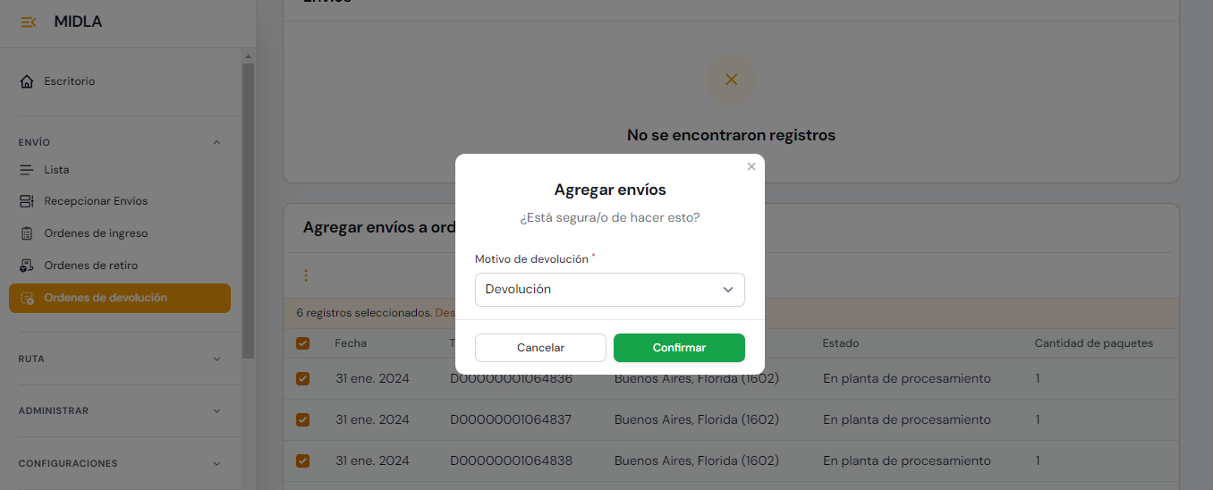 | En proceso de devolución | Indica que la devolución fue agregada a una Orden de devolución y ésta ya fue confirmada. |