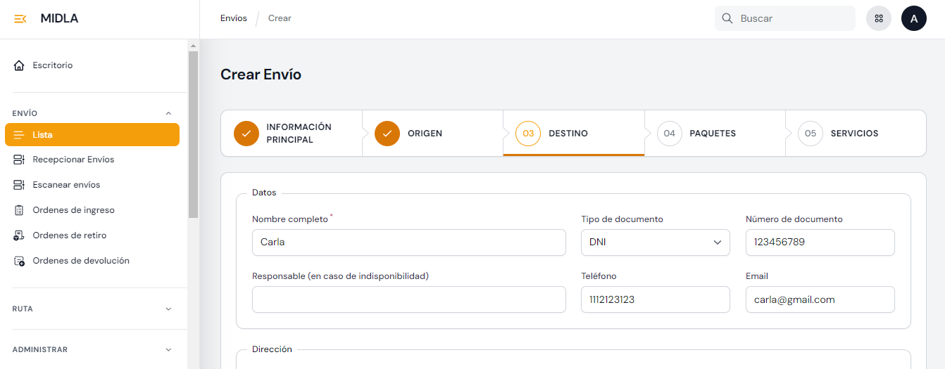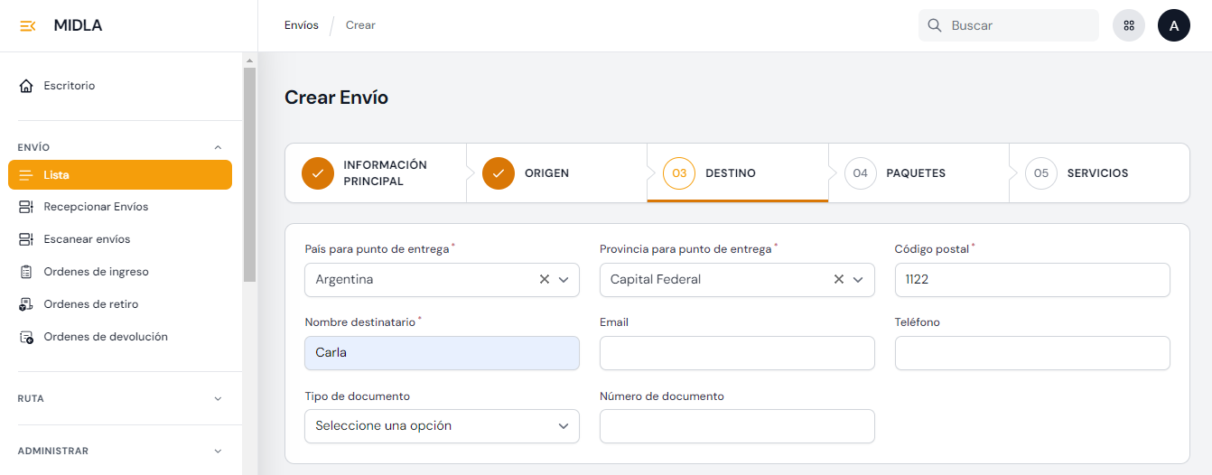 - Destino: En esta sección se especifica la información del destinatario, como Nombre completo y Dirección de entrega. Si el envío es una Entrega a Domicilio se debe ingresar la dirección de destino: País, Provincia, Calle, Ciudad y Código postal.