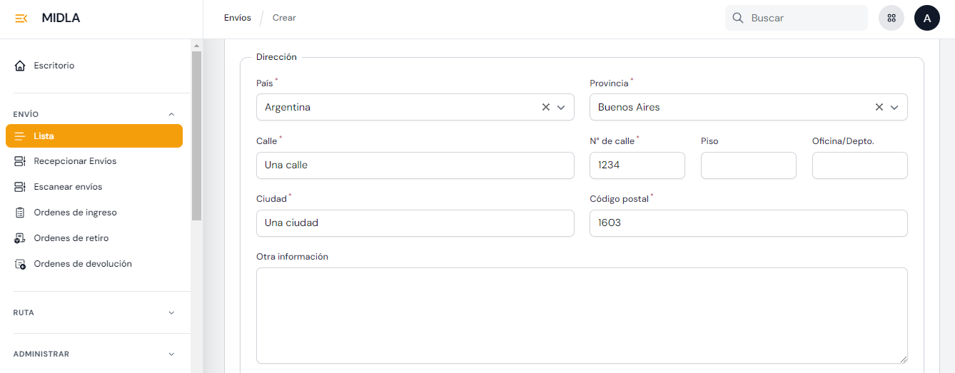En la Página Principal de Envíos haciendo clic al botón "Crear Envío" será redirigido al formulario de creación, donde podrá ingresar todos los datos relacionados al envío.