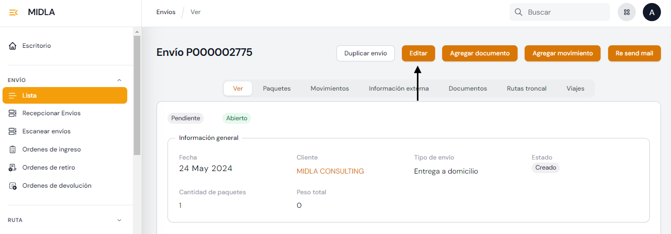 Todos los datos suministrados en la creación de un envío pueden ser editados mientras que el envío se encuentre en el estado Creado y no esté Validado. Para realizar esta acción, debe ingresar a la vista del envío y hacer clic en el botón correspondiente.