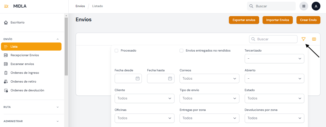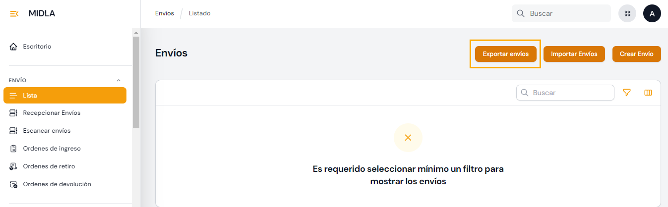 En esta vista, también se encuentran disponibles los botones para: Exportar envíos, Importar envíos y Crear Envío.