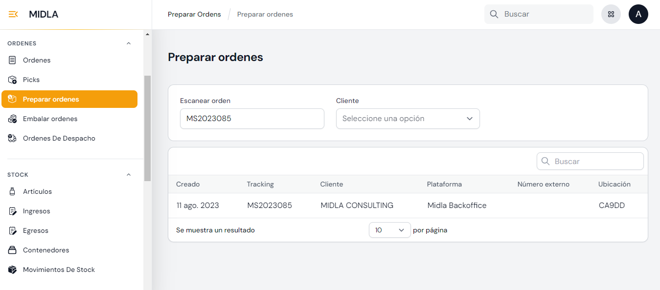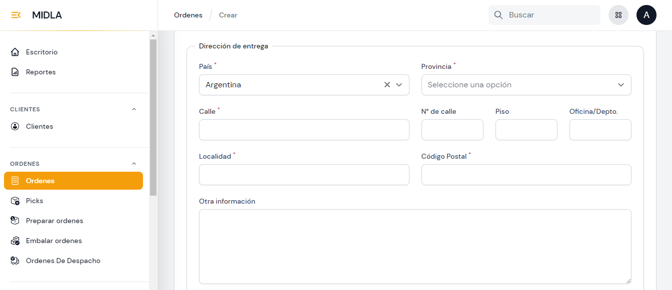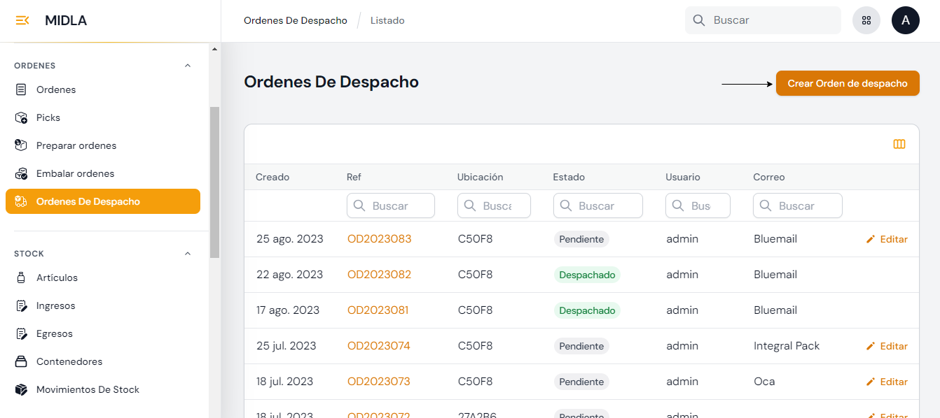 se puede realizar desde Órdenes de Despacho de la sección Órdenes del módulo WMS de Midla.