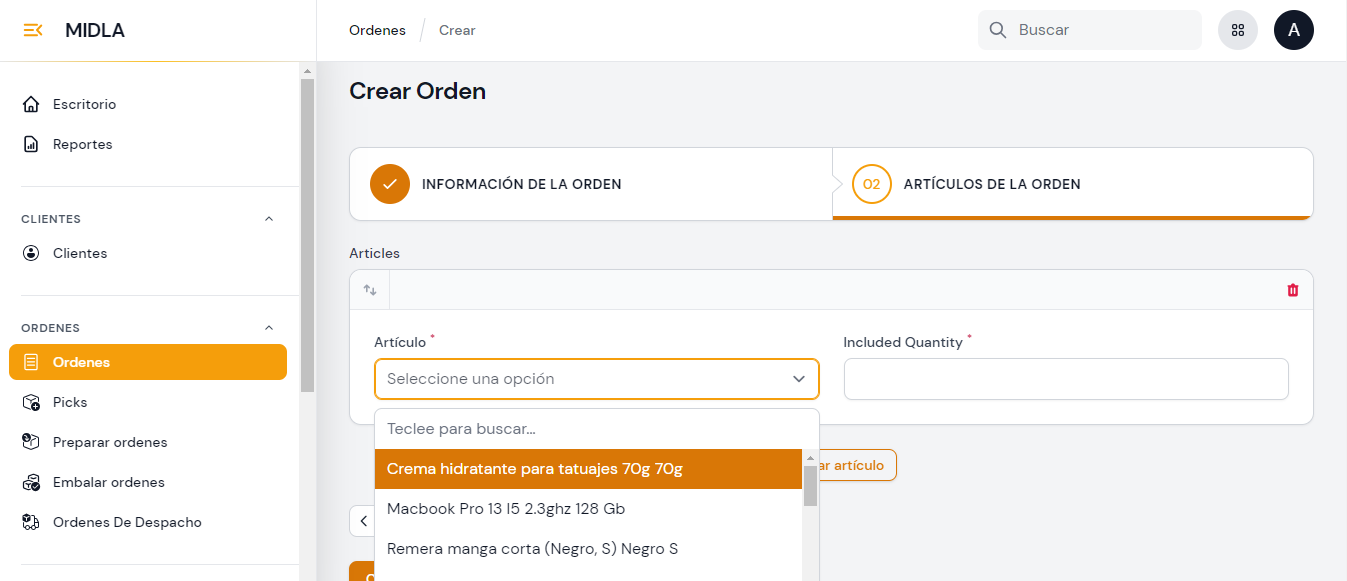 Artículos de la orden: Es necesario ingresar el nombre del artículo,