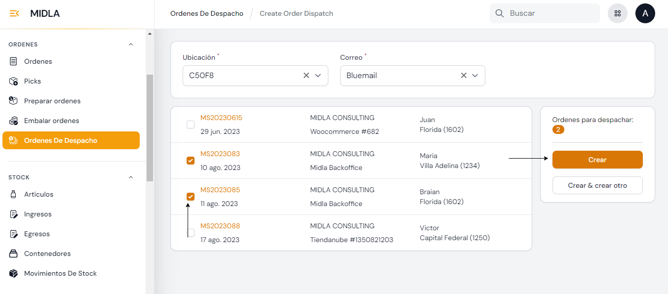 Seleccionar órdenes: Se debe seleccionar las órdenes que serán despachadas. En una