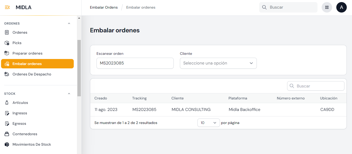Para comenzar el proceso de embalaje, el operador debe acceder al listado de órdenes para