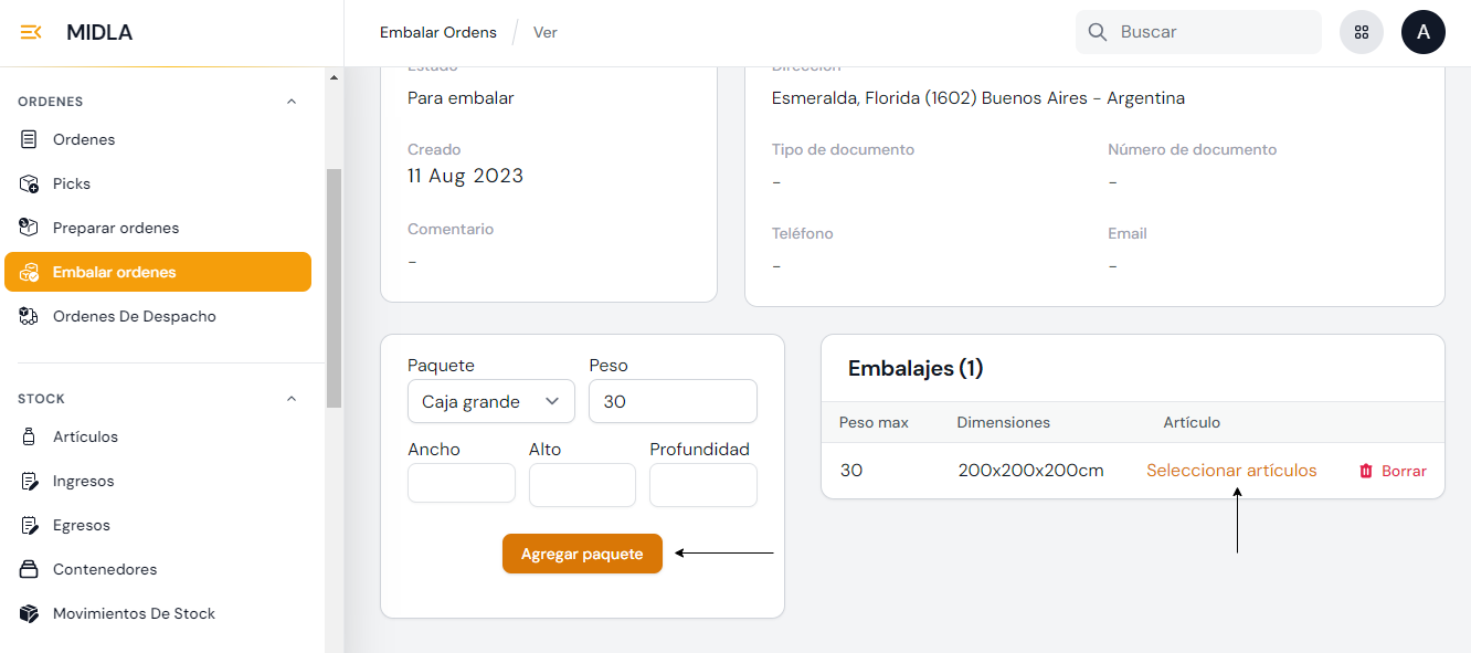 Asignación de artículos: Después de agregar el paquete, se debe asignar los artículos