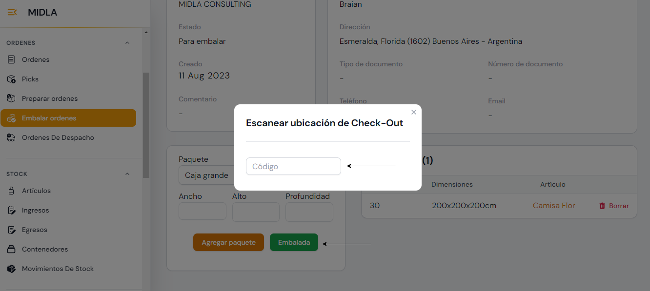 "Embalada" y escanear o ingresar el código de barras de una ubicación de tipo Check-out.