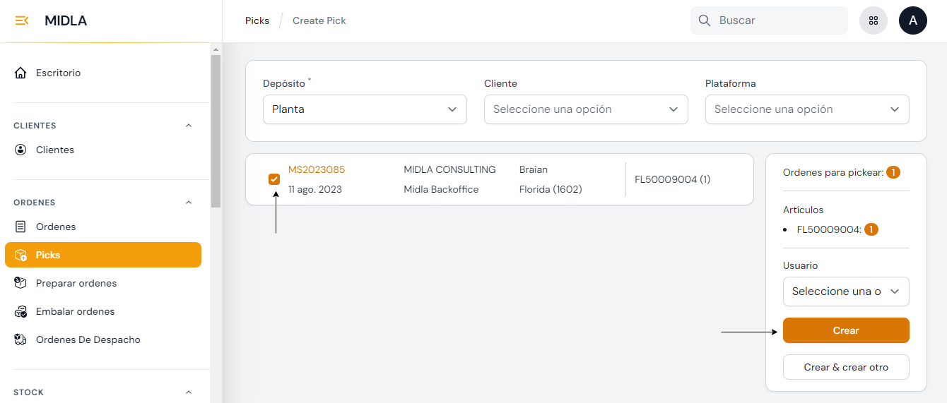 Opcionalmente se puede seleccionar el usuario responsable de realizar el pick. Si se