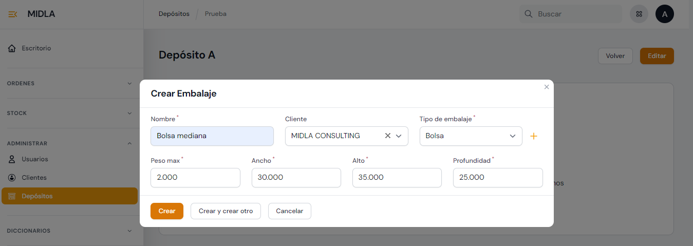Desde la vista de un Depósito, los operadores podrán crear Embalajes para utilizar en el proceso